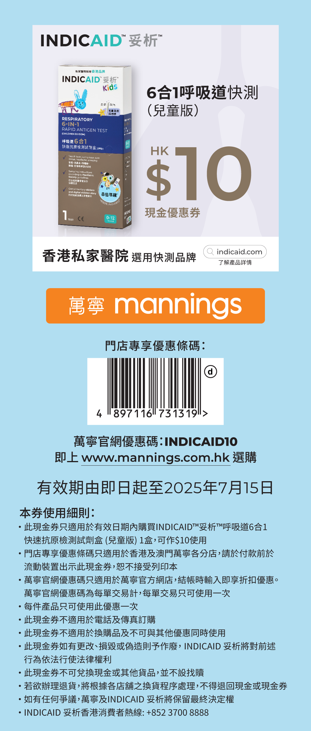 如果小朋友不幸患上流感或出現病徵,該如何是好?INDICAID™ 妥析™「兒童版呼吸道6合1快速抗原檢測試劑盒」可以成為小朋友的小伙伴,把握用藥黃金48小時,減少併發症風險,並專為兒童設計,讓檢測過程變得輕鬆又準確!
